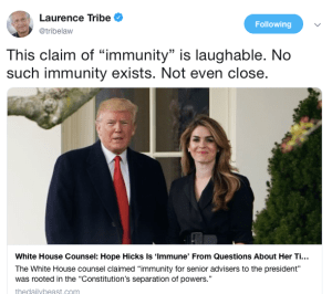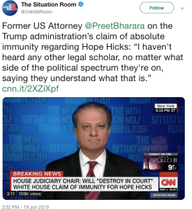 On June 18, White House counsel Pat Cipollone told Congress that former presidential aide Hope Hicks was “absolutely immune” from testifying about her work for Trump at the White House.