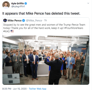 June 10: Pence visits the Trump-Pence campaign staff and tweets a photo showing no one wearing a mask and no social distancing by the workers. Then he deletes it: